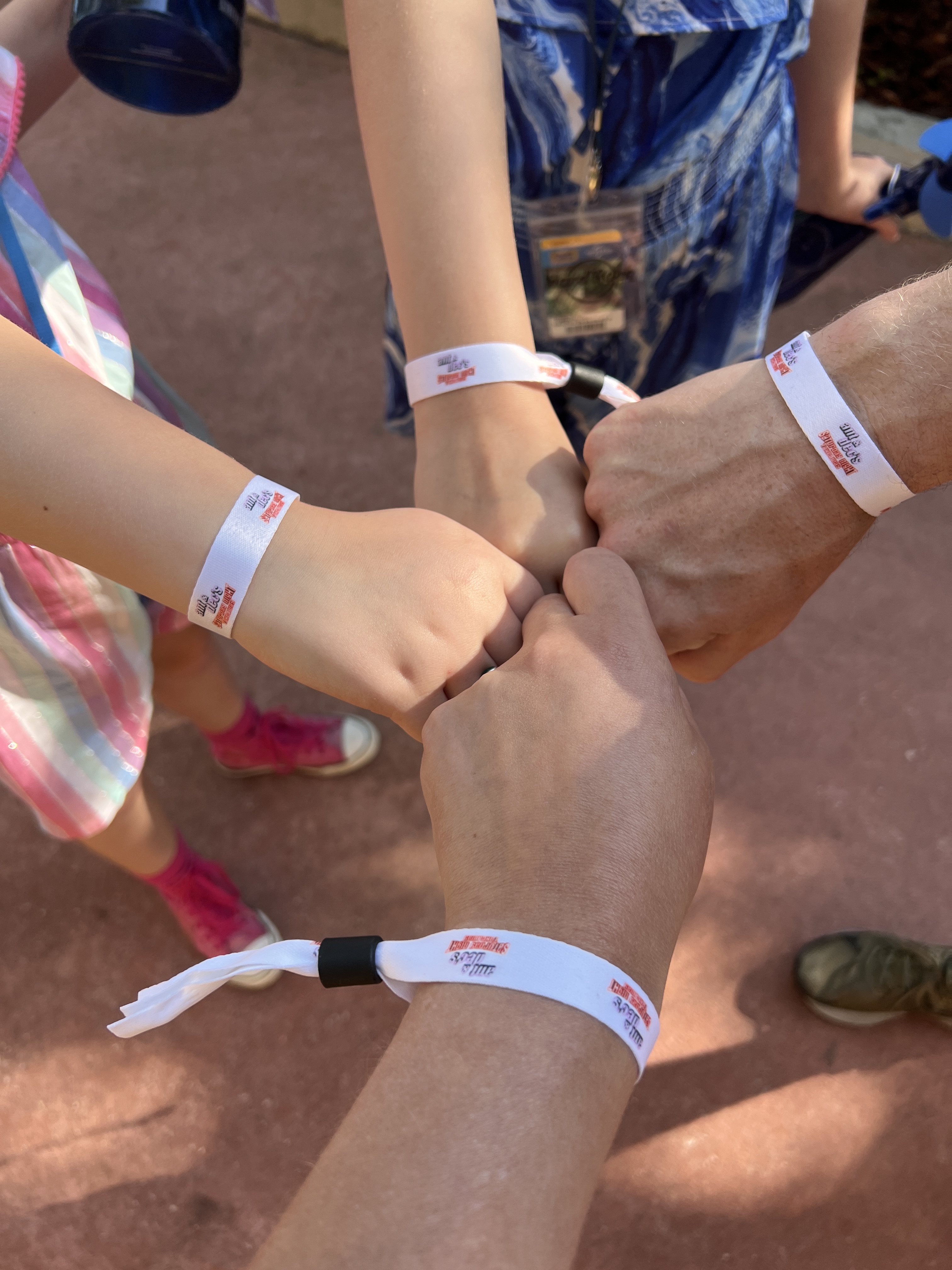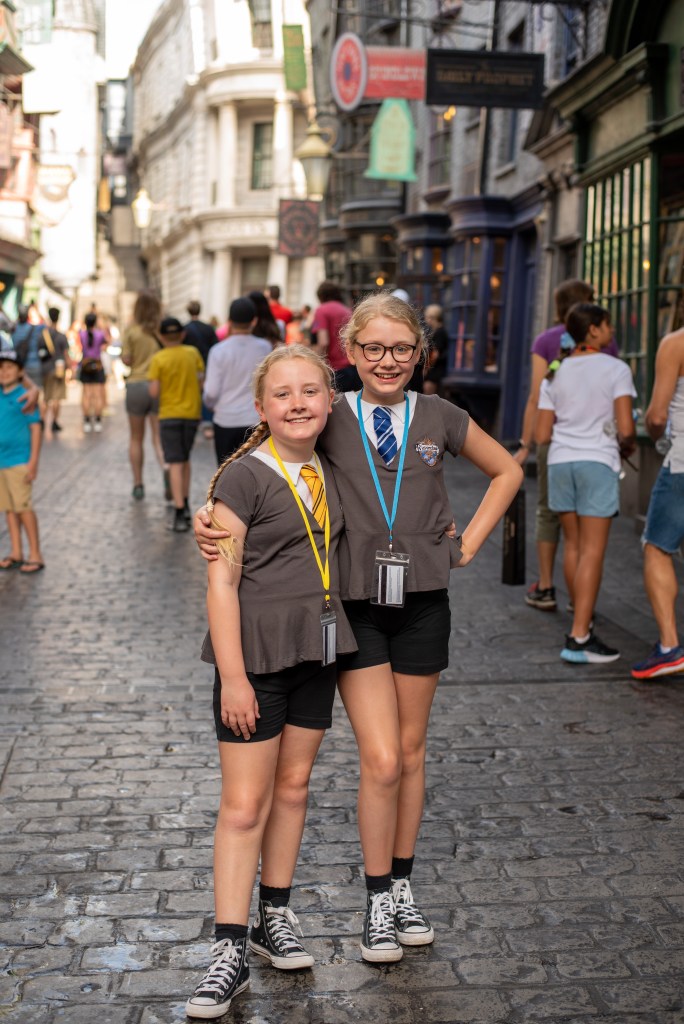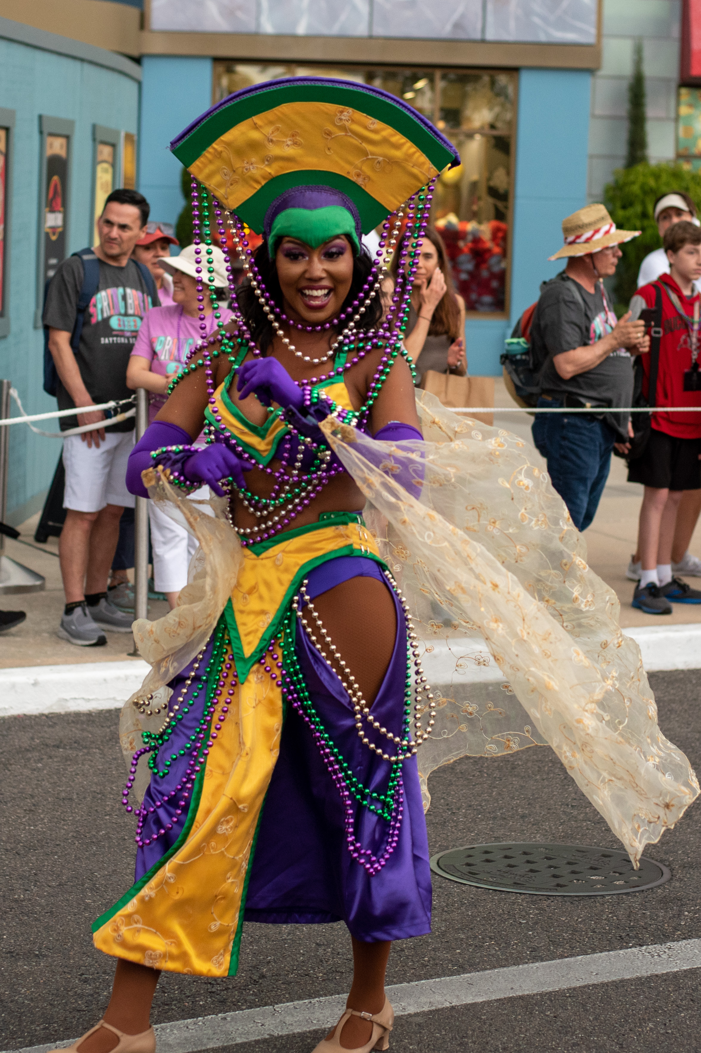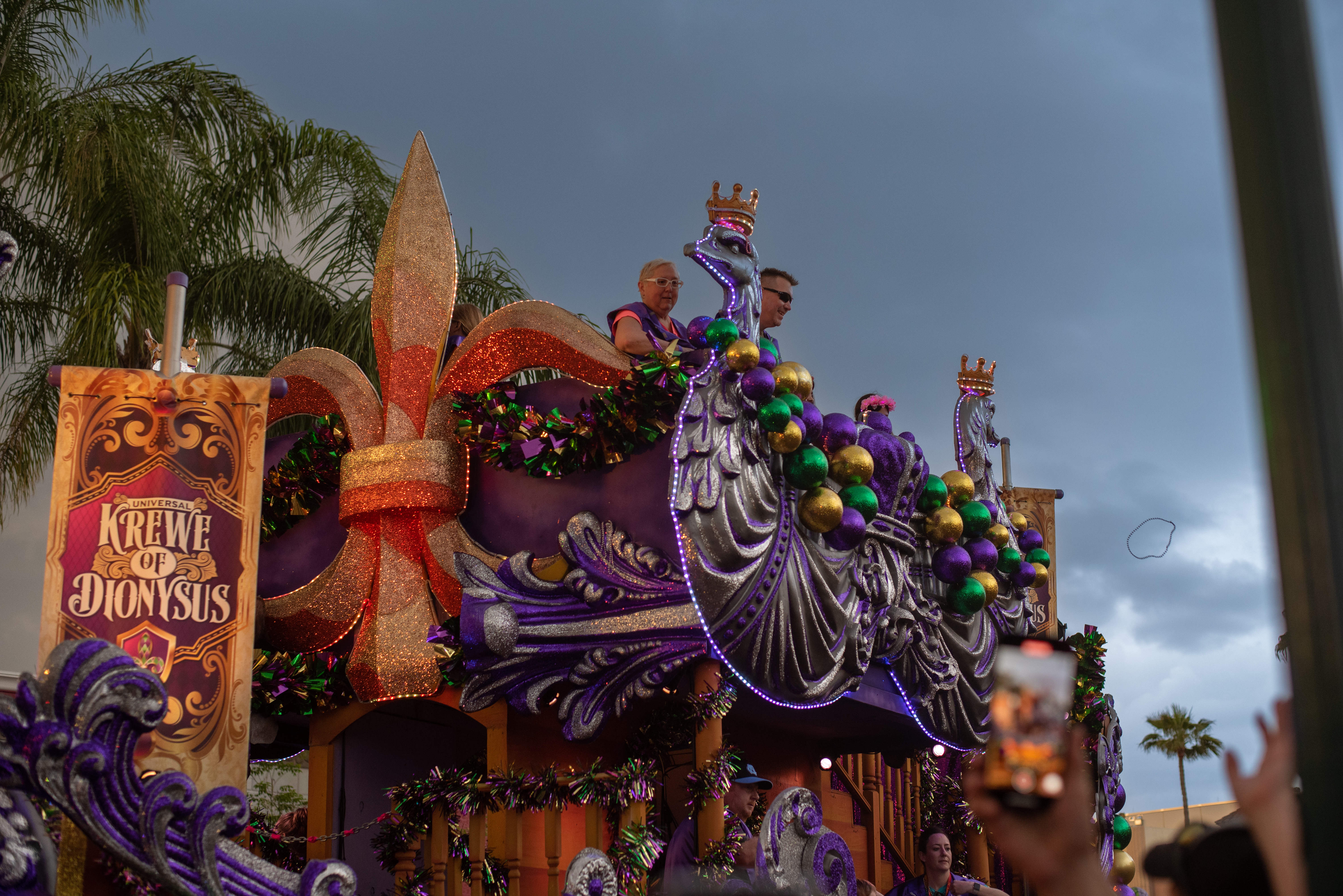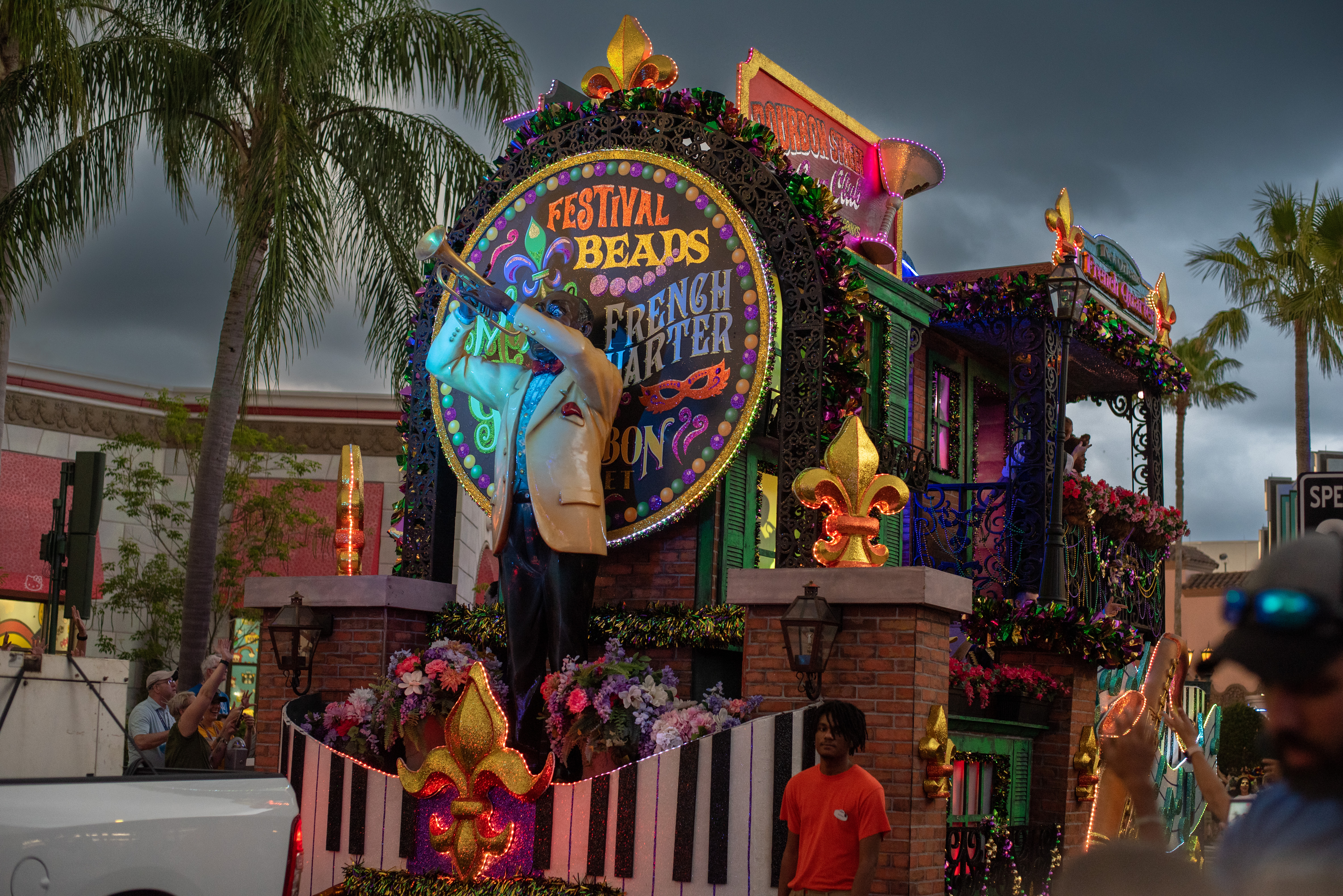 The Mardi Gras parade was at 7.30 and we got into the park around 6.45 (after a quick stop at Islands of Adventure for the girls to buy a toy they’d seen) and decided to grab a drink and just sit on the kerb and wait for it to start. We opted to stay on the exit side of the street at the start of the route so we could get out quickly afterwards. We mobile ordered Voodoo doughnuts for the girls which Steve went out to get, and by the time they’d finished them the parade was starting (they started it 10 minutes early to avoid the incoming weather which was great for us). It’s a really fun parade with lots of dancers and floats where beads are thrown out to you. The girls collected so many (I was rubbish at catching them and just ended up getting repeatedly hit in the face!!) It was so much fun, and we were all really glad we got to see it.