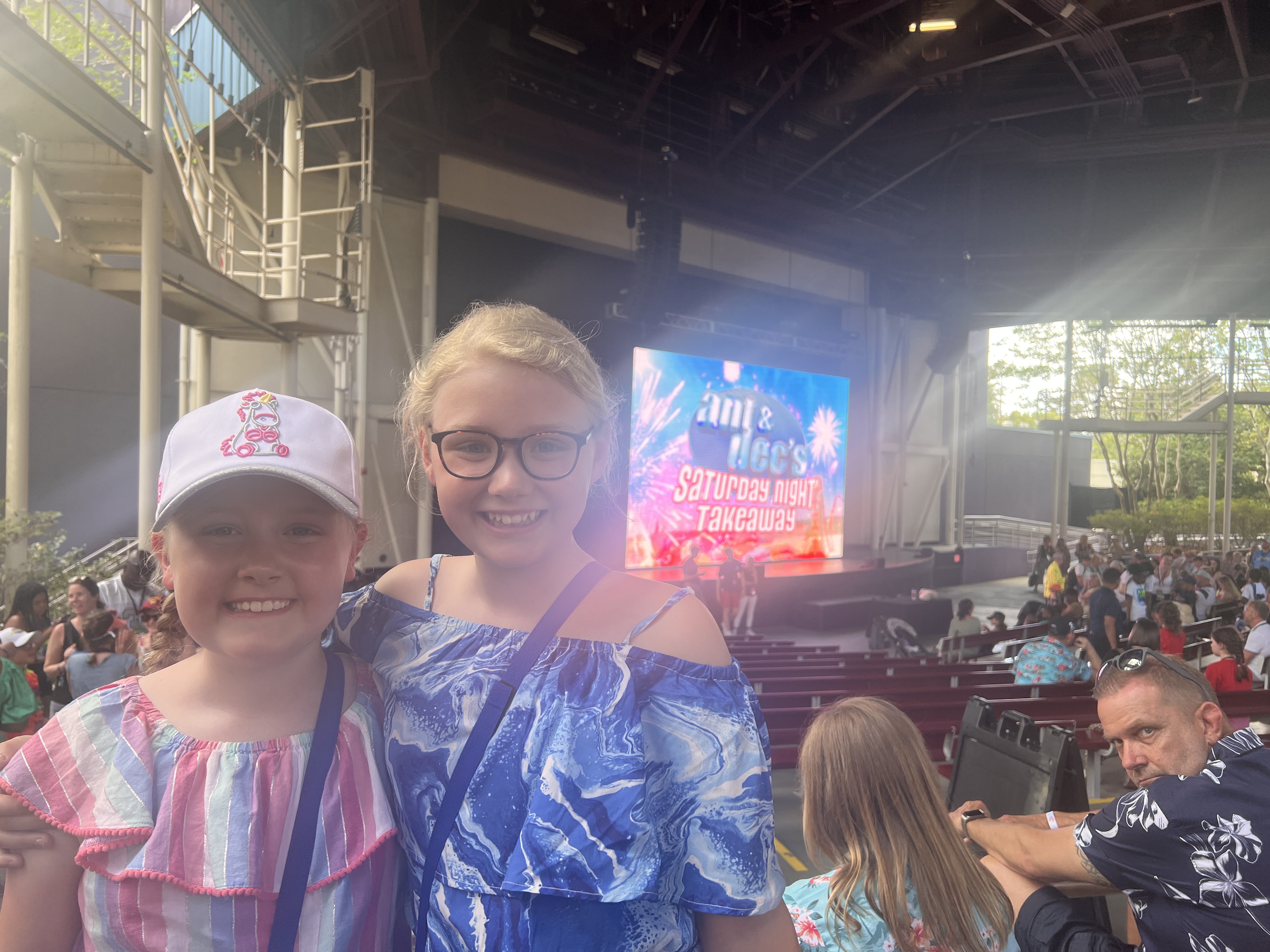 The following day we were hoping to see the live finale of Saturday Night Takeaway. I’d applied for tickets but not really expected to get them, but received an email as we were boarding the plane to say I’d got them. I knew they weren’t guaranteed though, so didn’t tell the girls until a few days ago, and made sure they knew we still might not get in. The result was that Winnie wanted to rope drop the queue for show wristbands at 8am even though the queue didn’t open until 9. It’s a good job she did. We were second in the queue but only around 8 families in total ended up getting white bands which guaranteed them a seat. Most of the audience was made up of people who had placed on the plane, people from previous weeks, corporate guests, and family members. Even with the elusive wristbands we weren’t convinced we’d definitely get in, until we were taken to the stage at 1pm! The girls were so excited, and even more so when we found we were on the end of a row so they were hoping that Ant and Dec might come past, and they did! Both Ant & Dec gave both girls a high five, which completely made their day. They didn’t stop smiling!!