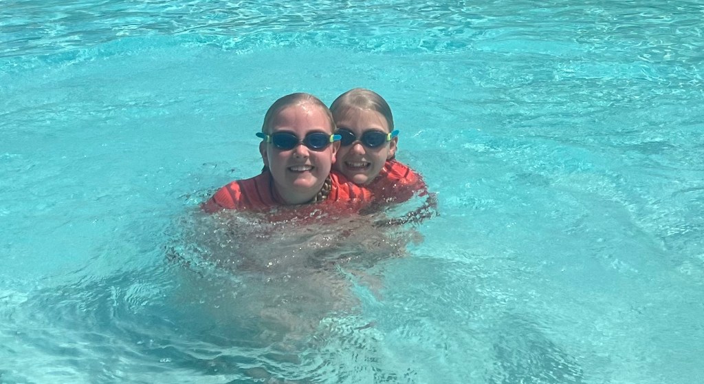 I went to the pool to tell everyone, and we decided that as the sun was shining (we’d had a few cool, cloudy, and wet days) we’d stay there for a while. Steve & I got chatting to a Canadian couple who were telling us all about the Adventures by Disney trips they’d been on which sounded amazing, and the girls played one of their weird make-believe games in the pool.