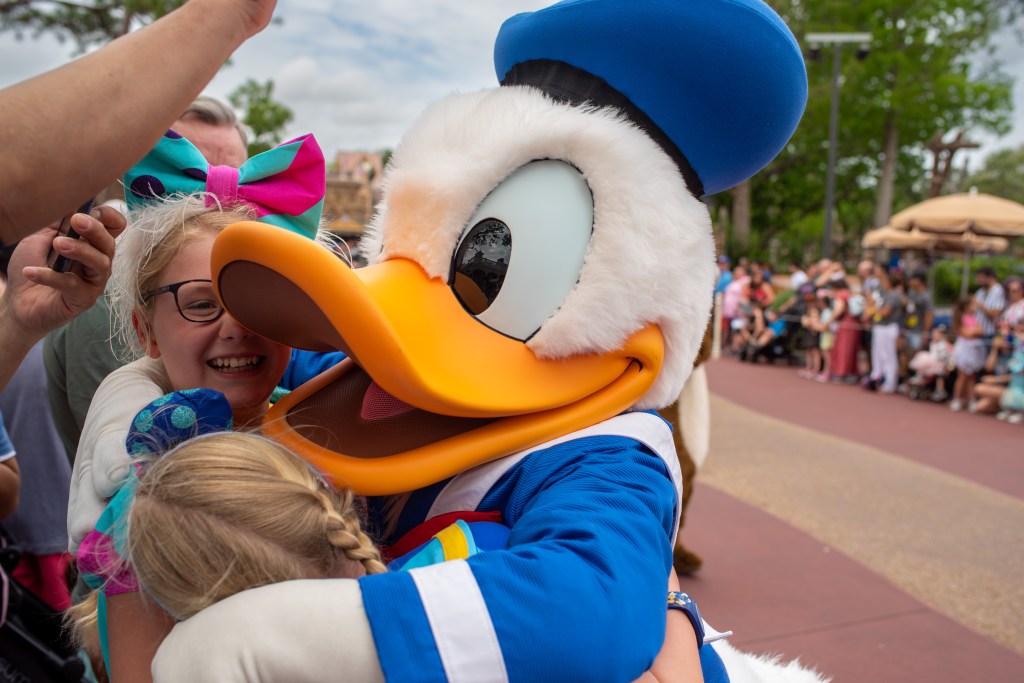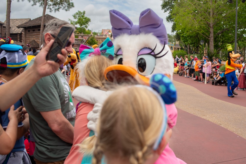 It was then just about time for Festival of Fantasy. It was much cooler today, so we didn’t have to worry about finding shade, but still ended up in the same spot just up from Liberty Tree Tavern. As the weather was a bit temperamental Mickey, Donald etc were in their regular clothes, which is always fun to see as they don’t often appear in those together.