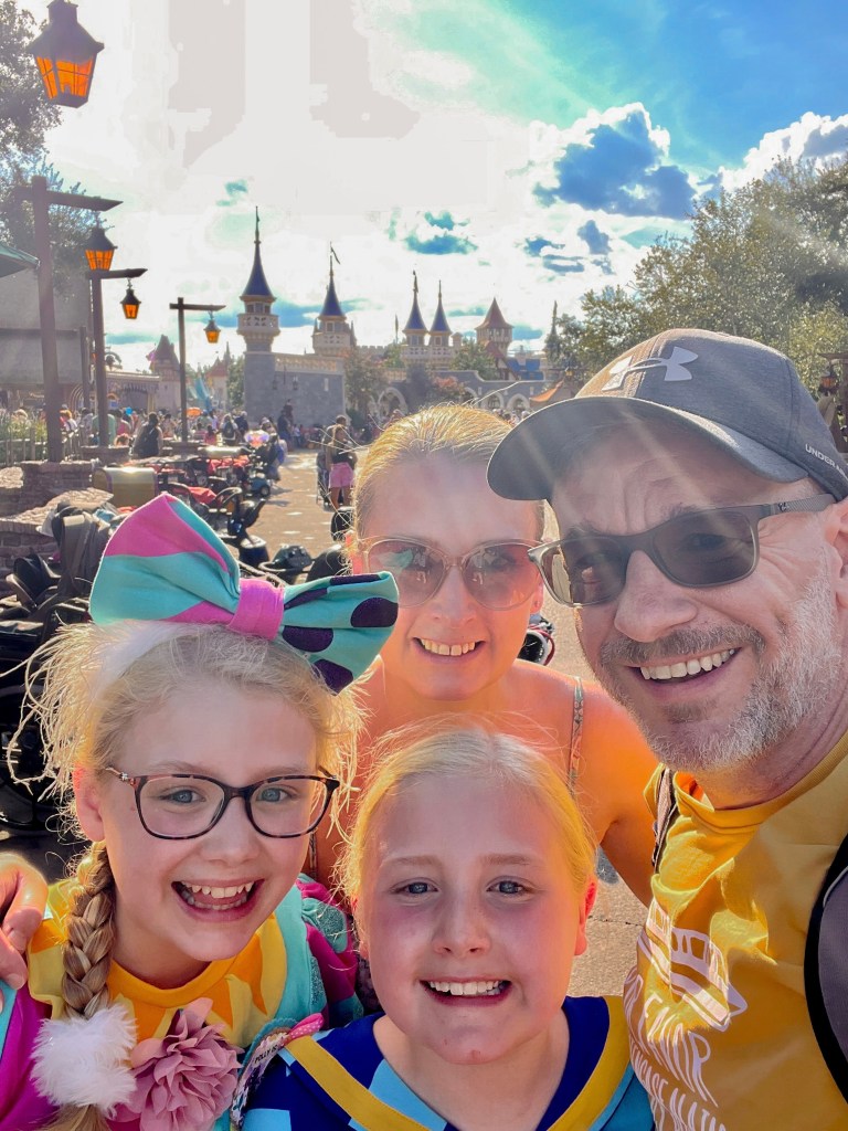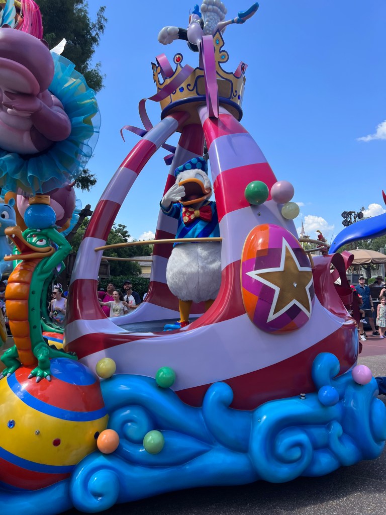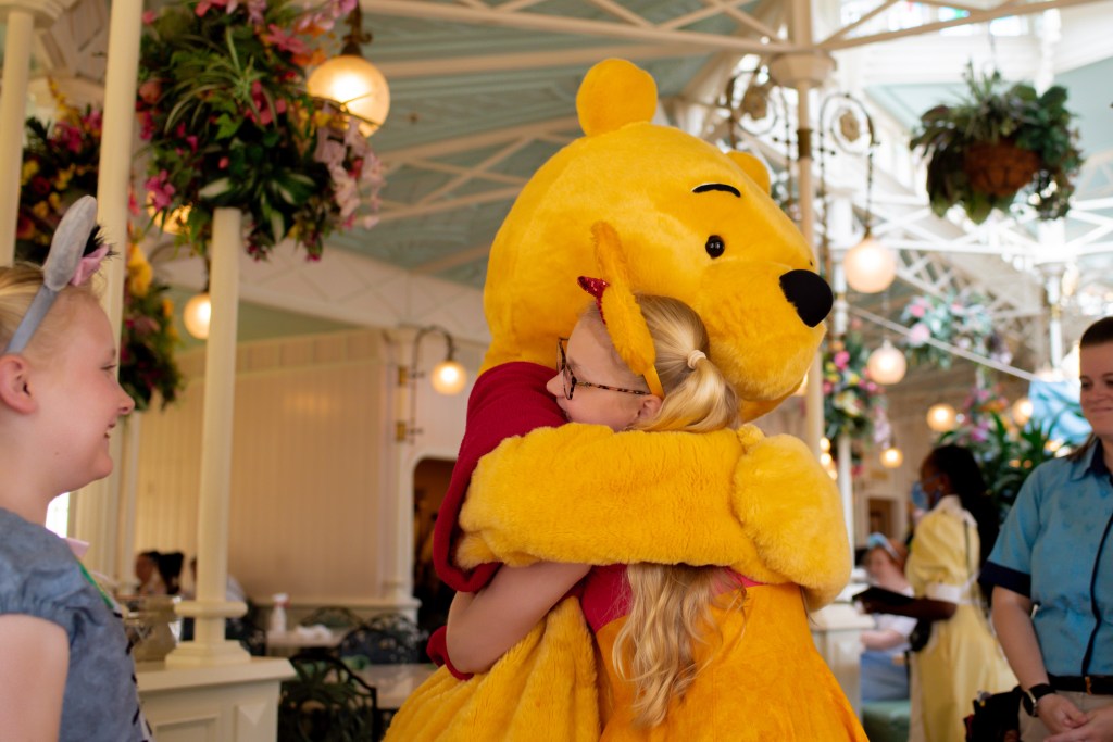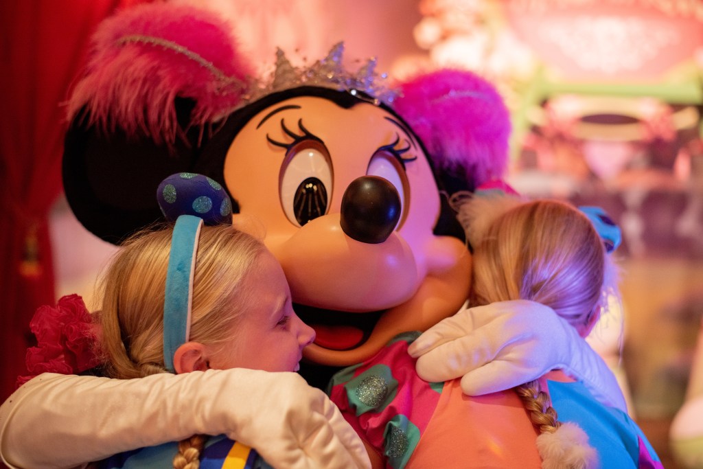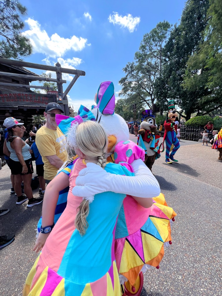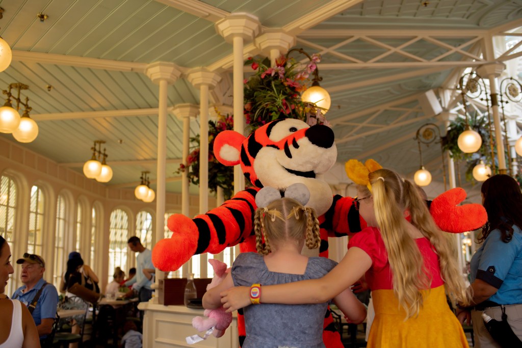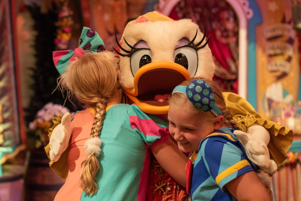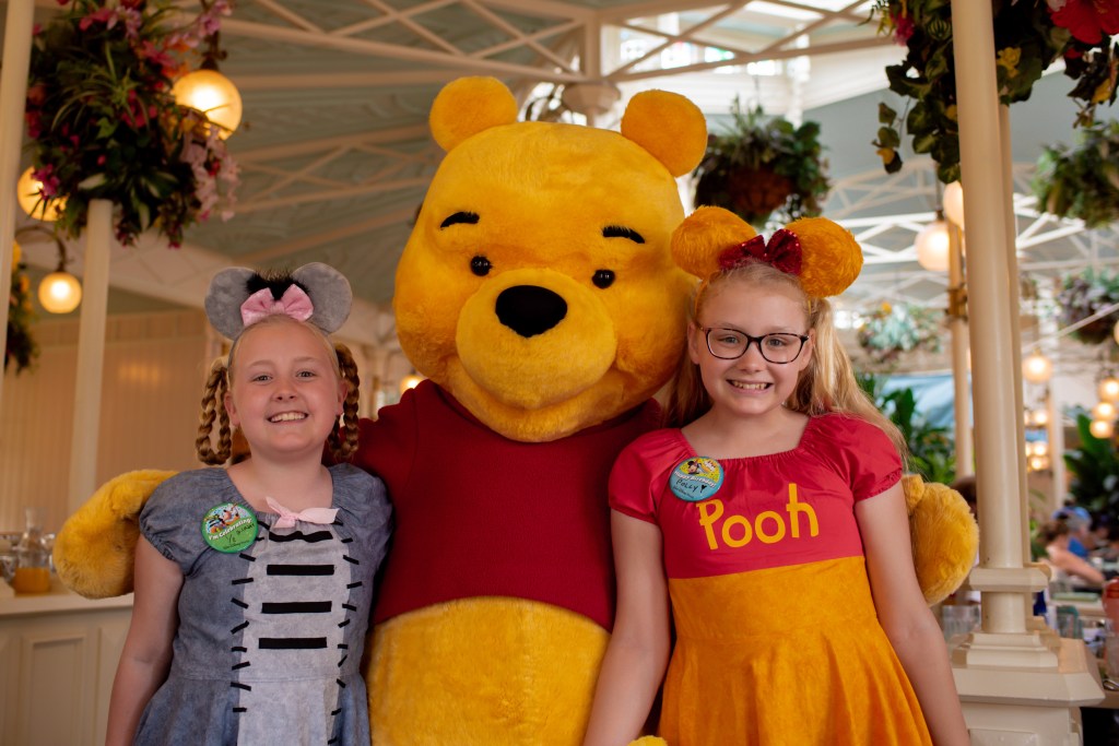 The day started by waking up around 6am to pack and check out of Portofino Bay, before grabbing an Uber to head to Disney. We were checking in to Grand Floridian for 6 nights. Apart from the universal part of the trip and the cruise, the hotels are all covered using DVC points and we are still in rollover mode from cancelled trips. We knew about the construction and weren’t too worried as we don’t tend to hang around in the lobby as it never feels thar relaxed to us. We dropped our bags and checked in and headed straight to Magic Kingdom where we made rope drop. This wasn’t the plan (we only needed to be there for our breakfast reservation) so the girls and I went into the Emporium where they immediately found something to spend their gift card on, and then went for some photos on Main Street while Steve got his coffee! As we were heading to Fantasyland, the welcome show started and both Donald and Daisy saw the girls from backstage and waved/ pointed at them which made their morning as the ducks are their favourites. We rode Pooh before heading straight to meet Mickey.