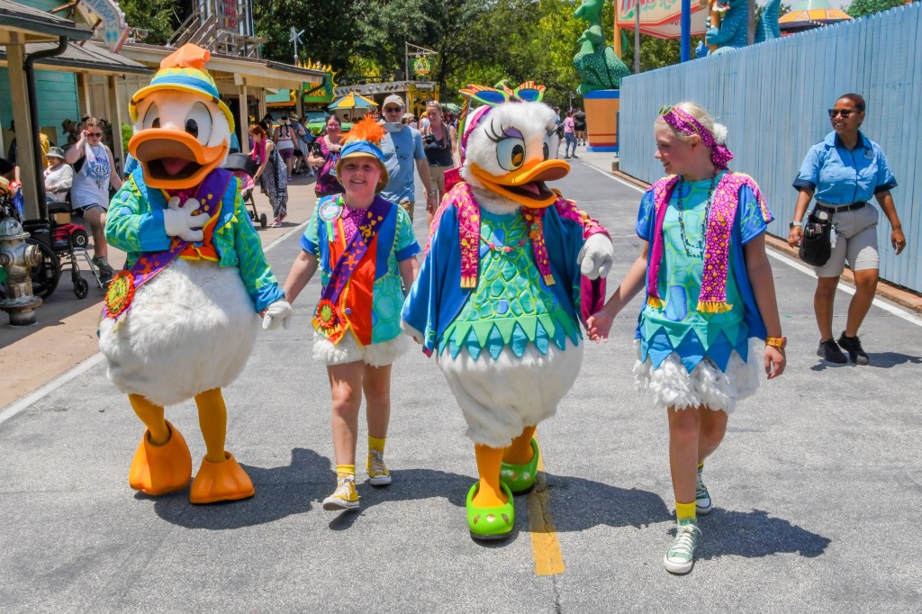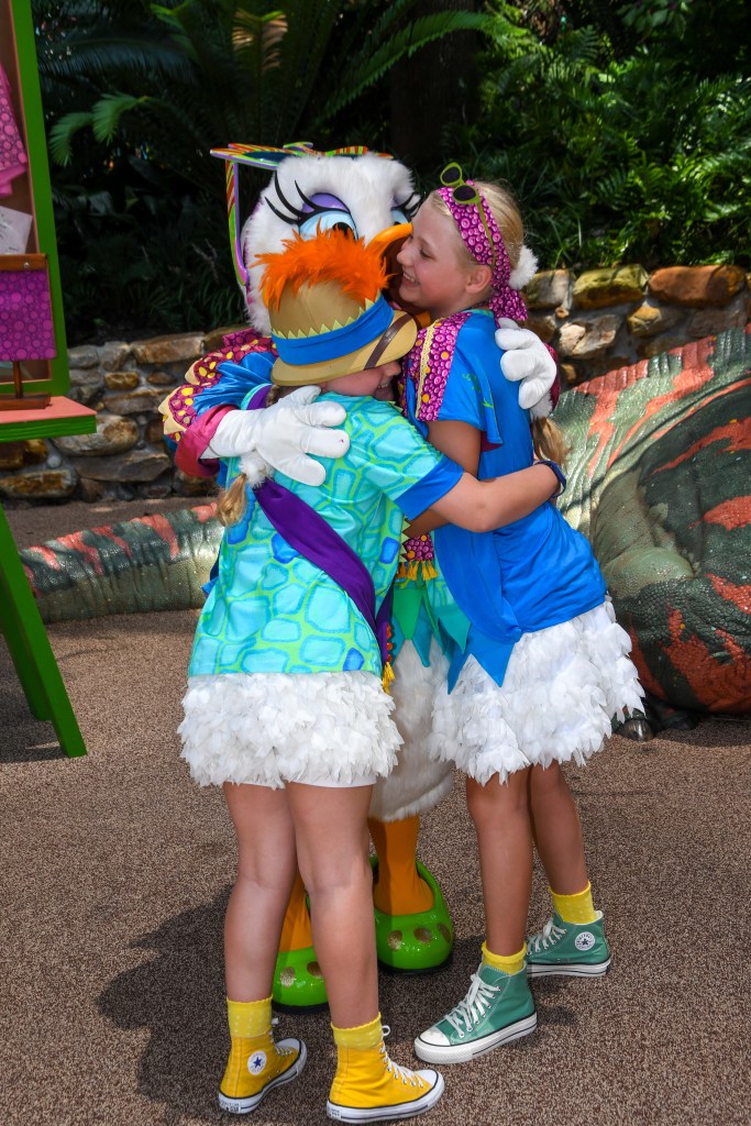 She spent a good while with the girls, taking photos before pretending to walk off and leave them to do the meet, before she took their hands and ran off through Dinoland to find Donald. I tell you what, for a duck that girl is fast!! The poor photopass photographer was trying to chase her and take photos, all in the baking heat!! She got to Donald just before he went inside for his break, and they both walked with the girls before giving them lots of hugs.
