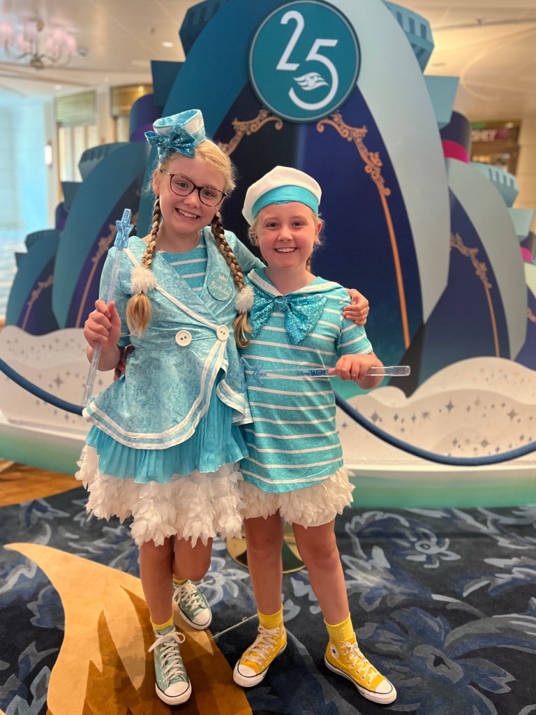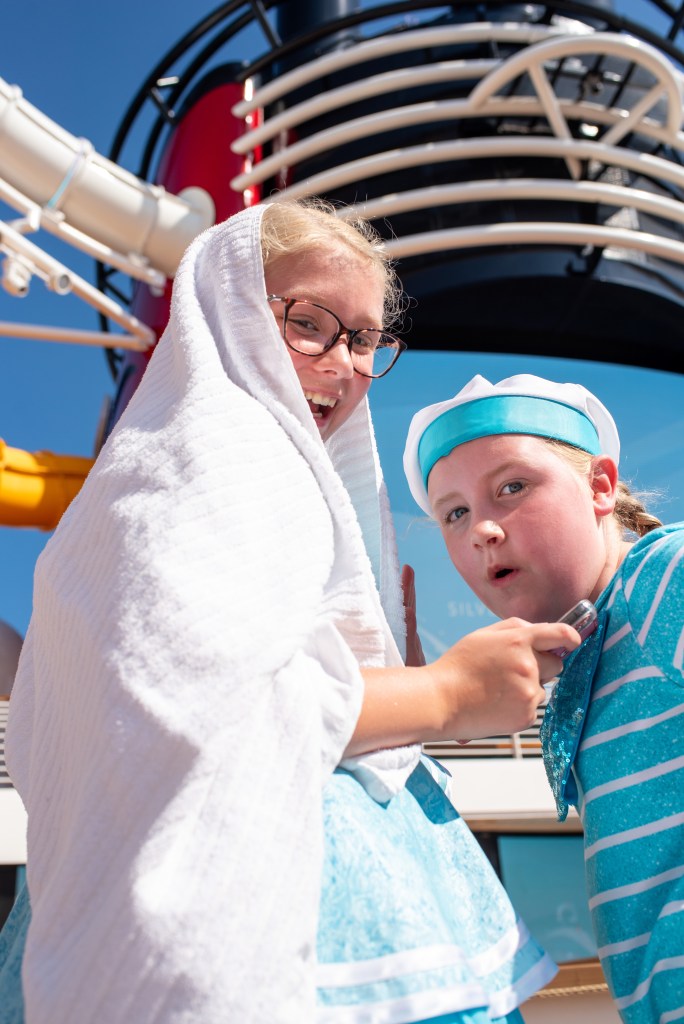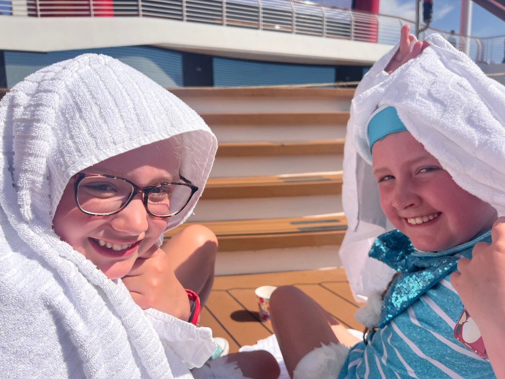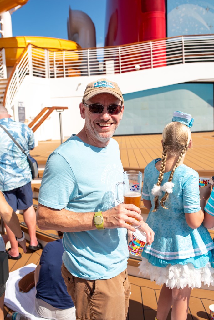 It was now time to head to the muster drill which took longer than it should as lots of families were missing, before going to watch the sail away party. It was so hot by this point, with no real shade anywhere that gave a good viewing point. We were sat on two towels and the heat from the deck was still burning! Steve kept himself cool though as he bought the refillable beer mug which gets you refills which are much bigger and a lot cheaper than a regular beer, and more than paid for itself. We, on the other hand, resorted to towels over our heads while we waited, along with most other people, but the girls were so excited to see the characters.
