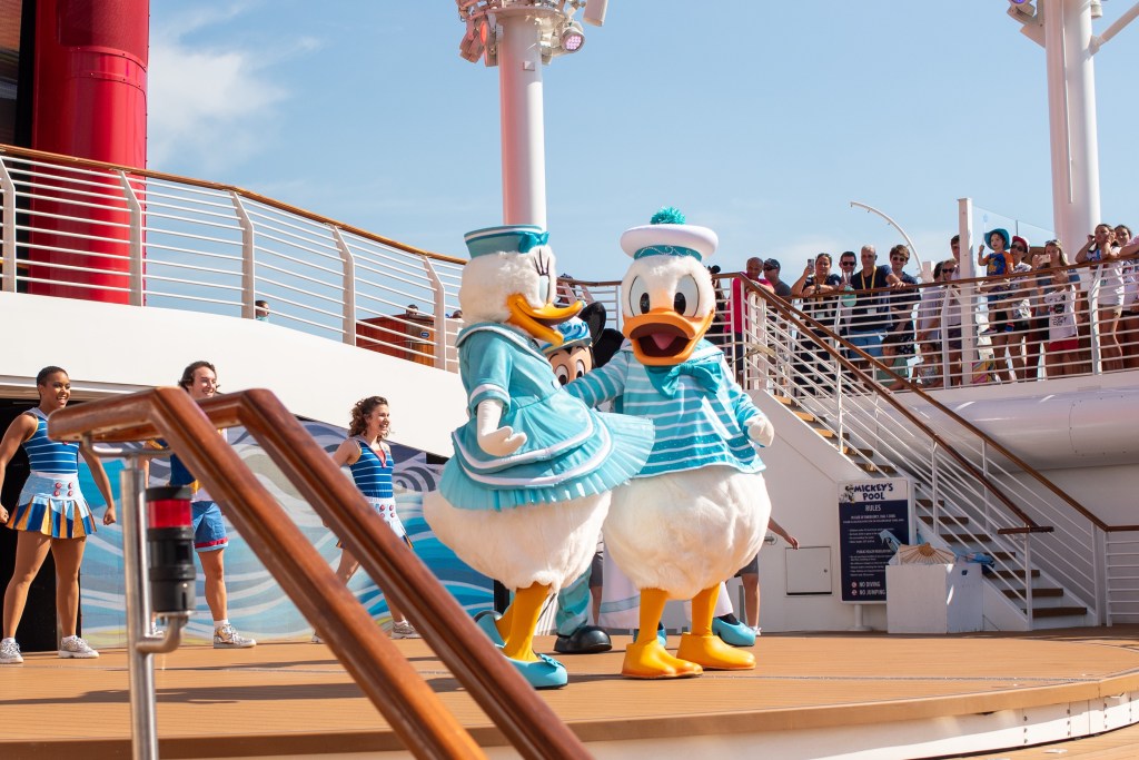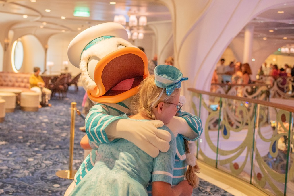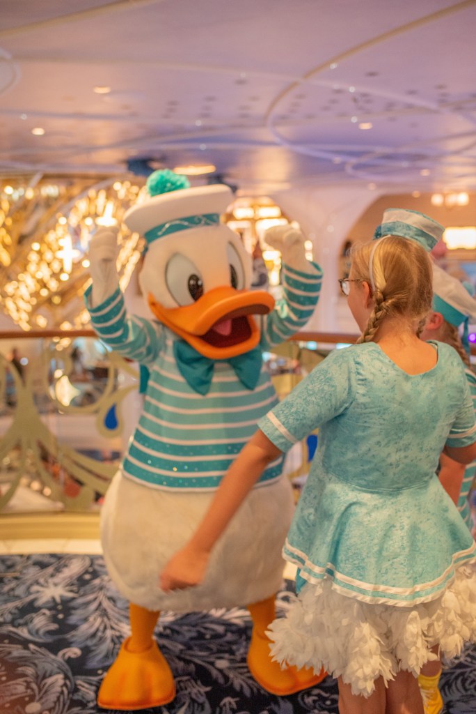 We then set off to meet Donald in his silver sailing outfit. I think all 4000 people on board had the same idea as it was crazy busy. Literally as busy as leaving Magic Kingdom after fireworks. It was hard to get anywhere and quite stressful, especially with a little anxious one, and we did start up question if this cruise was for us, but Winnie’s face meeting Donald made it worth while.