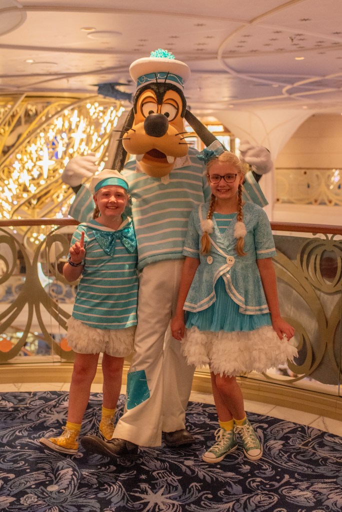 Daisy wasn’t meeting until 10pm, which is late for the girls, but they really wanted to meet her and we realised the excitement of the day would likely carry us through. Plus, we had our first show in the theatre (a mixture of Disney characters and songs) which took up a chunk of time. We also had a look in the shops, although we didn’t buy anything, and met Goofy, and before we knew it it was time to meet Daisy.