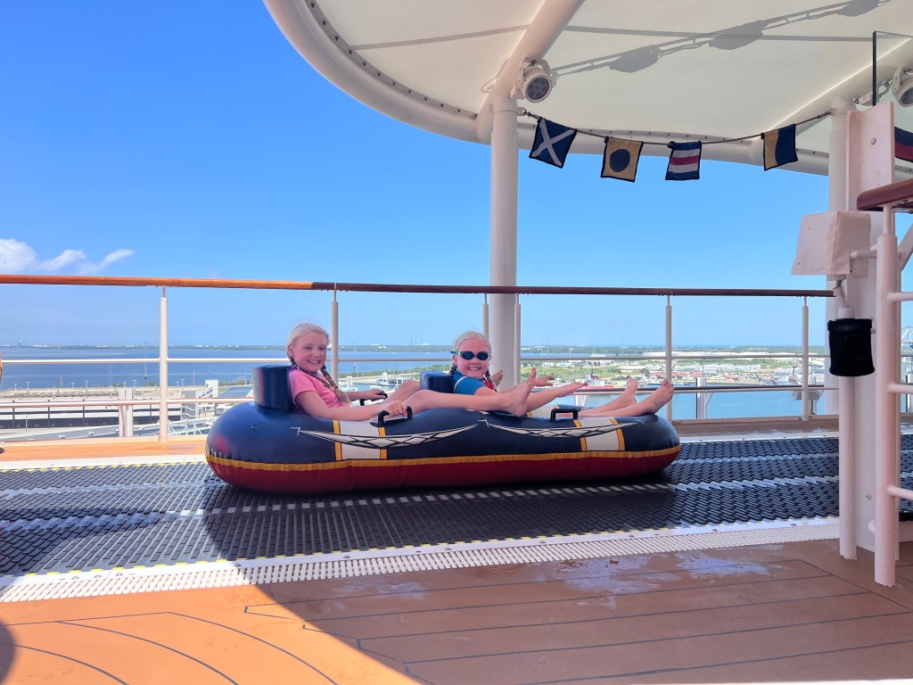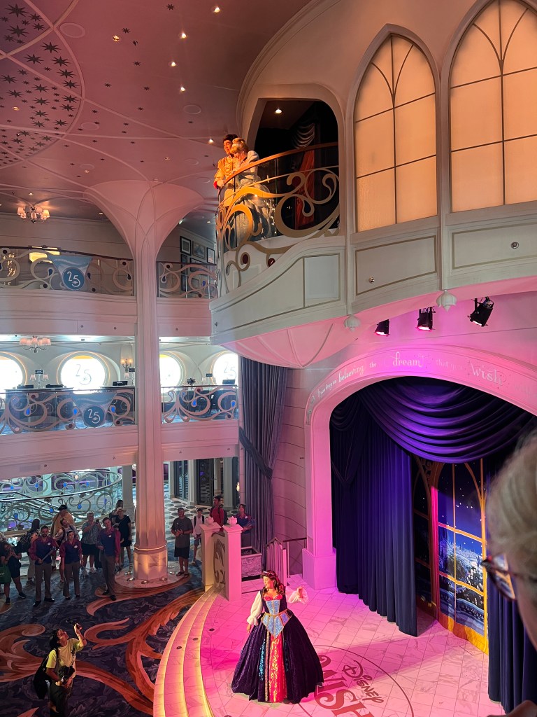 Some of you may remember that we were meant to do this cruise last summer, but as Winnie’s anxiety got the better of her a few days before we were scheduled to sail, we ended up moving it to this year instead. We’ve only ever done one cruise in the past which was one of the UK Disney cruises just after Covid, that just sailed in a big circle, so weren’t really sure what to expect, but we’re hoping for a bit of a rest after our busy start to the trips at the parks.We used Disney transport from the Grand Floridian as we decided that although the cost was a bit higher for 4 of us than getting a car, the convenience would be worth it. You also get an earlier boarding group with it, which meant more time on the ship. The journey took around an hour, check in was easy and we didn’t wait long at all to be called onto the ship.