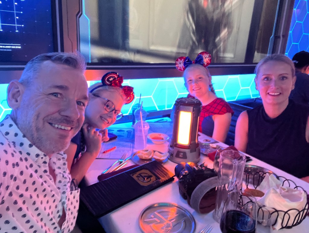After the show we went inside for a quick clean up before heading for tea. Our first meal was in the Marvel restaurant which was themed brilliantly and had a continuous fun show running on the screens throughout the meal. The dining rooms are pretty crammed in though. There are barely any gaps between tables, so you feel like you are sat with the people next to you and there is no privacy. Luckily, we had a lovely family next to us. The food was good, although it was our least favourite of the 3 nights (we were slightly worried as the food on the UK cruise was really nothing special but needn’t have been) and the servers were so lovely. I think the girls would have bought our lovely Turkish assistant sever home with us. They had as many hugs with her as with the characters! On our way out of the restaurant Spiderman was walking around and ran up to Winnie to say he liked her outfit, which she loved.