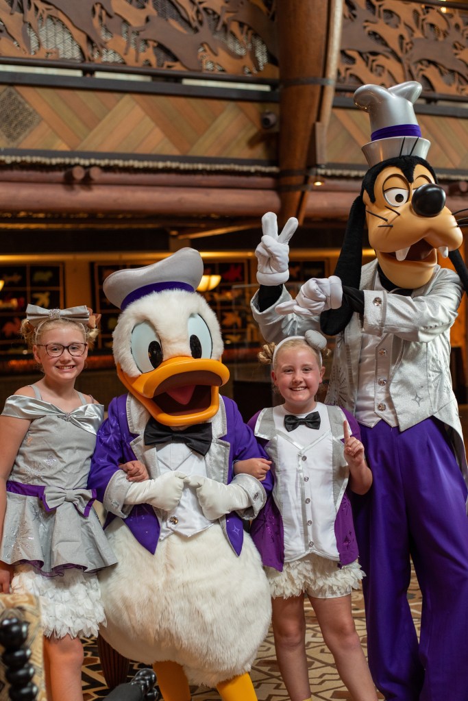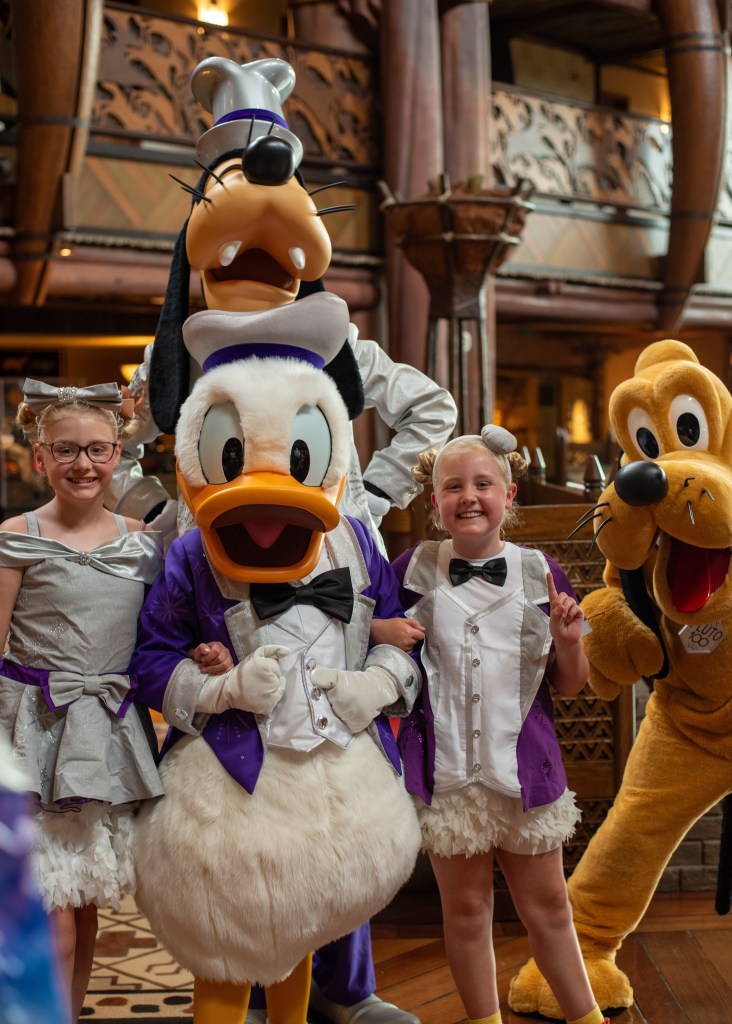 The bus took a good 45 minutes to arrive, by which time we were absolutely melting, but we’ve been spending a lot of time talking with the girls about how things often happen for a reason, and that even though something seems annoying/ bad, it may lead to something good that wouldn’t have happened otherwise. Well, the late bus turned out to be a perfect example of this because as we walked up to the lobby after being dropped off we saw the 100th bus parked up meaning the characters were inside in their 100th outfits. Now, you all know how much the girls love Donald & Daisy, and as we are going to California for Steve’s 50th later in the year I’d made them 100th outfits. However, we forgot it would be Halloween season, and they’d likely not be wearing them, so put it down to one of those things until we saw that the characters were randomly meeting at hotels in their outfits. We knew the odds weren’t high with us spending so much time at the parks, but had the outfits in our bag that we took to the pool just in case. This particular morning we put them in the park bag, so had them with us. Anyway, a mild panic change later the girls were so excited to meet Donald & co. I was frantically trying to sort my camera settings and text Jade to let her know they were there, whilst also watching Goofy torment Donald (he was so funny and kept saying Donald was number 2!!)