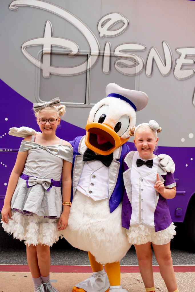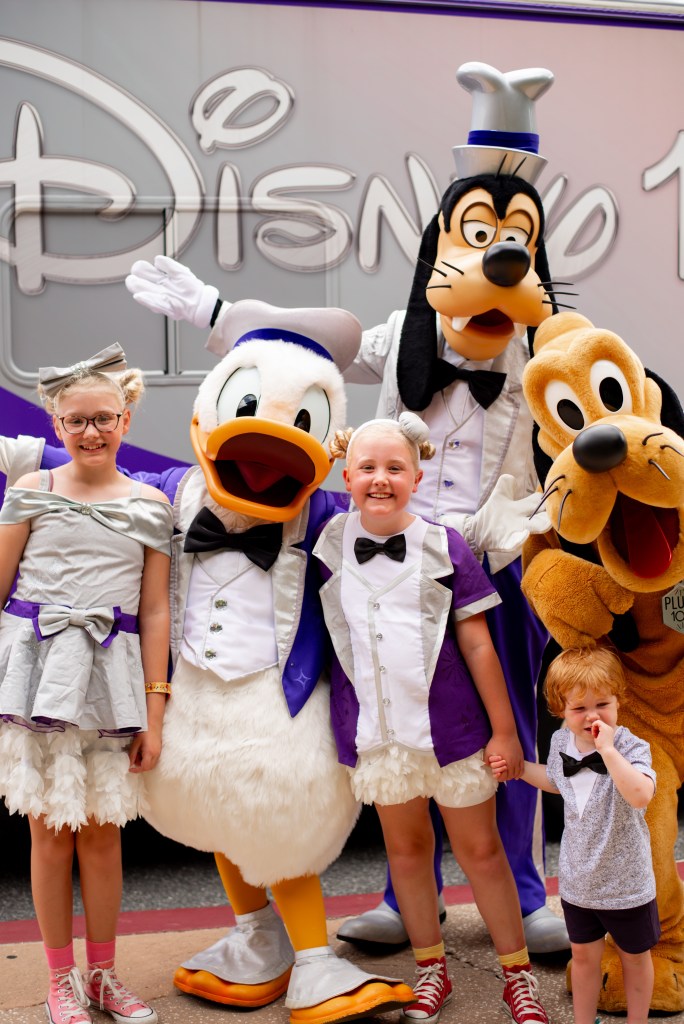 The lady who was with the characters asked if the girls would like to walk them back to the bus, which they did and loved. Goofy was putting an excessive amount of hand sanitiser on everyone and gave them the giggles. They then had a few photos before saying goodbye to their favourites. It honestly made their trip and was so special. And now Steve doesn’t have to lug the outfits around any more, so he’s definitely happy!
