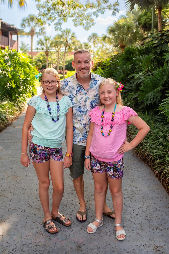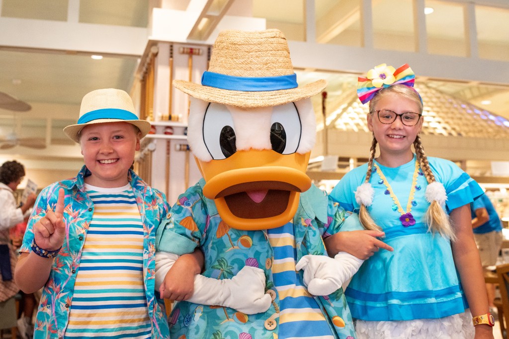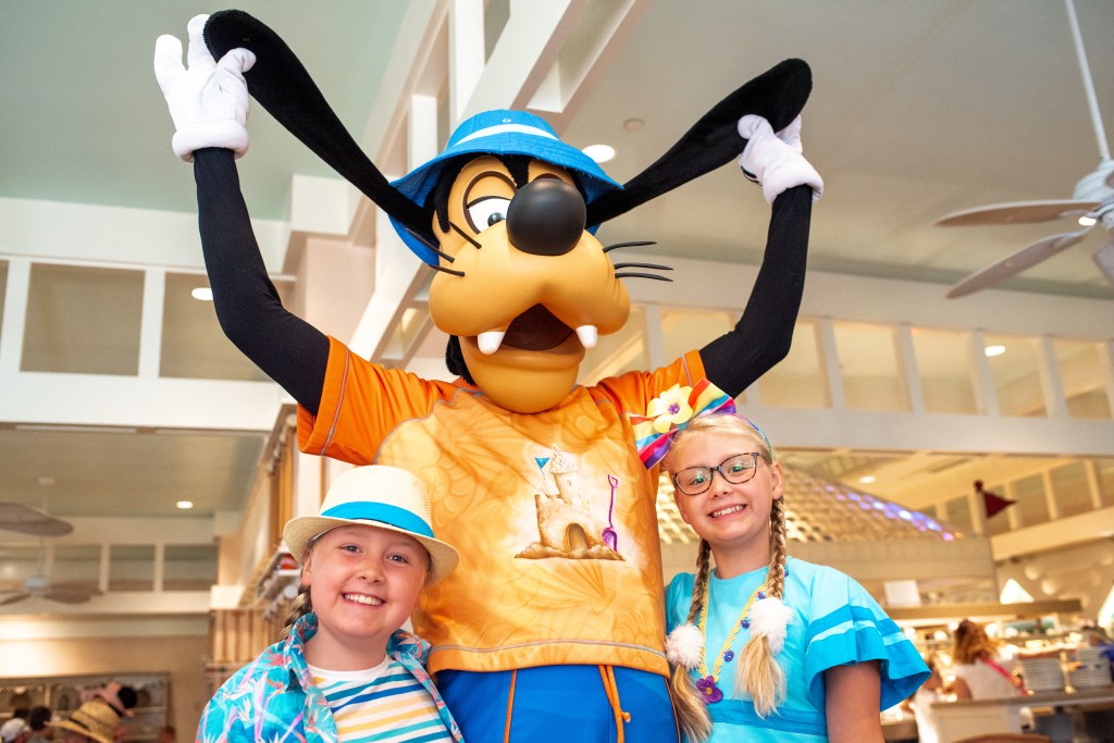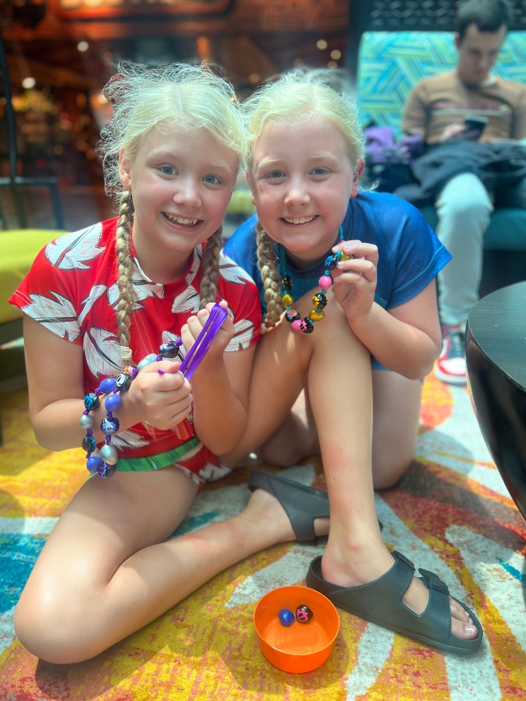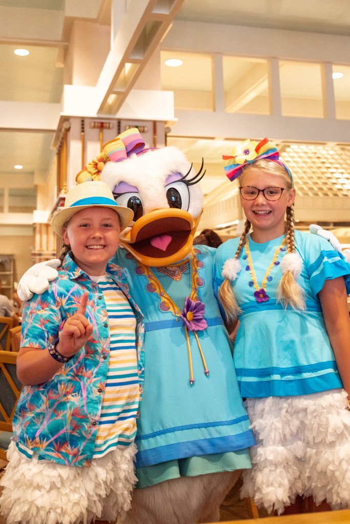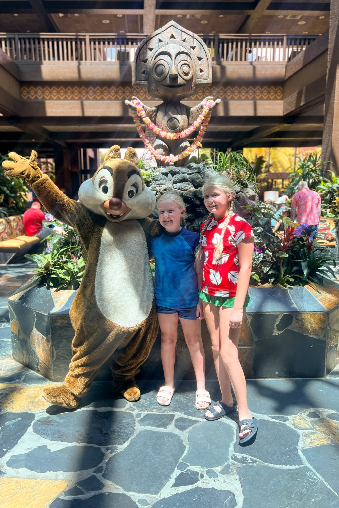 As they were making them Chip, Dale and Daisy came into the lobby so they jumped up for a photo with Dale. The lobby meets are lovely but pretty chaotic, and you kind of have to just jump in for a photo. The girls really aren’t the pushy types so everyone was jumping in ahead of them, until Dale took their hands and walked them off to the statue area away from everyone. It was so nice that he noticed how they’d hung back. He then spent a while telling them he liked to eat the flowers, and they talked about his groovy moves at the Moonlight Magic party. The characters really don’t hang around long, and left very soon after so the girls got back to their leis. Polly kept threading her beads in the wrong order so I think I untied as many knots as I tied, but they loved the finished result.